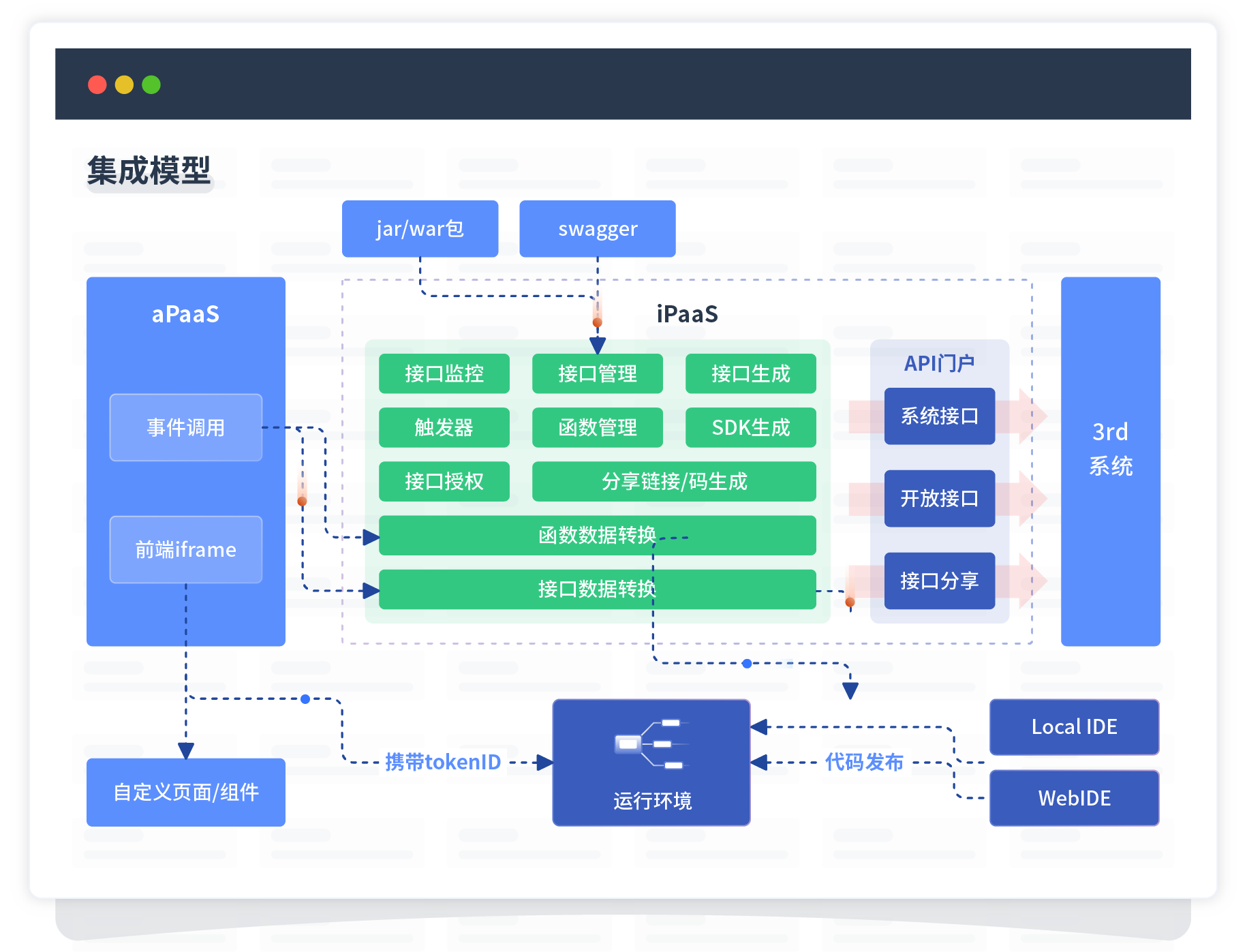 集成模型包括平台本身前、、、、、、、、、、、、后端能力的扩展,,,,,也支持通过API门户和第三方系统进行交互。。。。。。