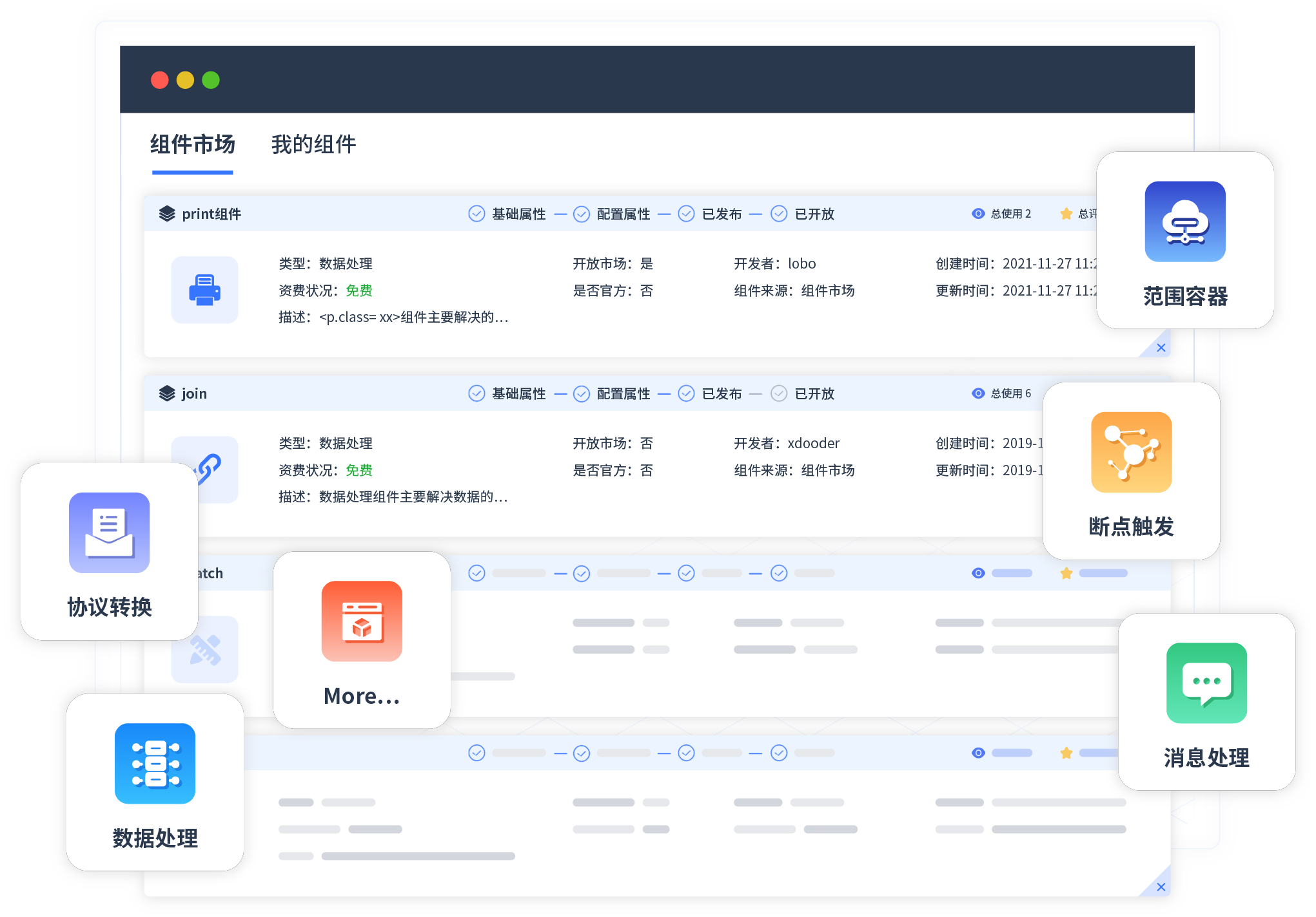 针对集成场景,,,,,VIVO钱包提供组件市场,,,,,,,,例如协议转换、、、、、、、、、消息处理、、、、、、、、、、、文件操作等。。。。。。。。。。。。。。。。除平台提供的组件外,,,,,,,,,客户可以自定义所需组件。。。。。。。