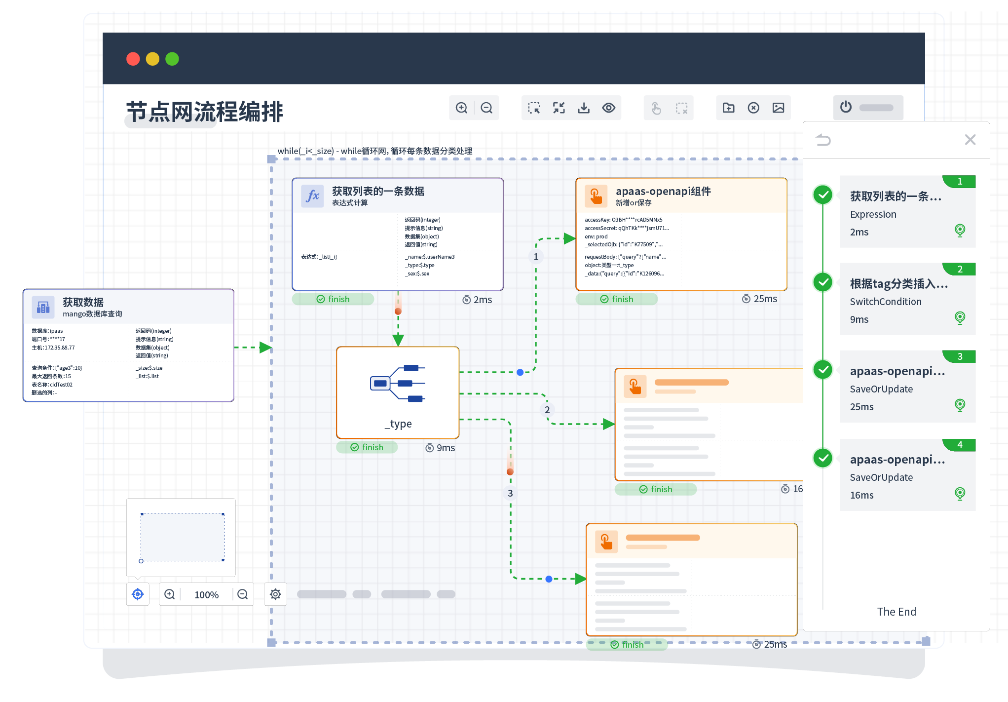 针对集成场景,,,,,,组件定义后支持进行流程编制,,,,,,,不同于传统代码方式,,,,,,,,,,通过图形化展示,,,,,,,,支持在线调试、、、、、、、、、、、、日志查看和运行回放。。。。。。。。