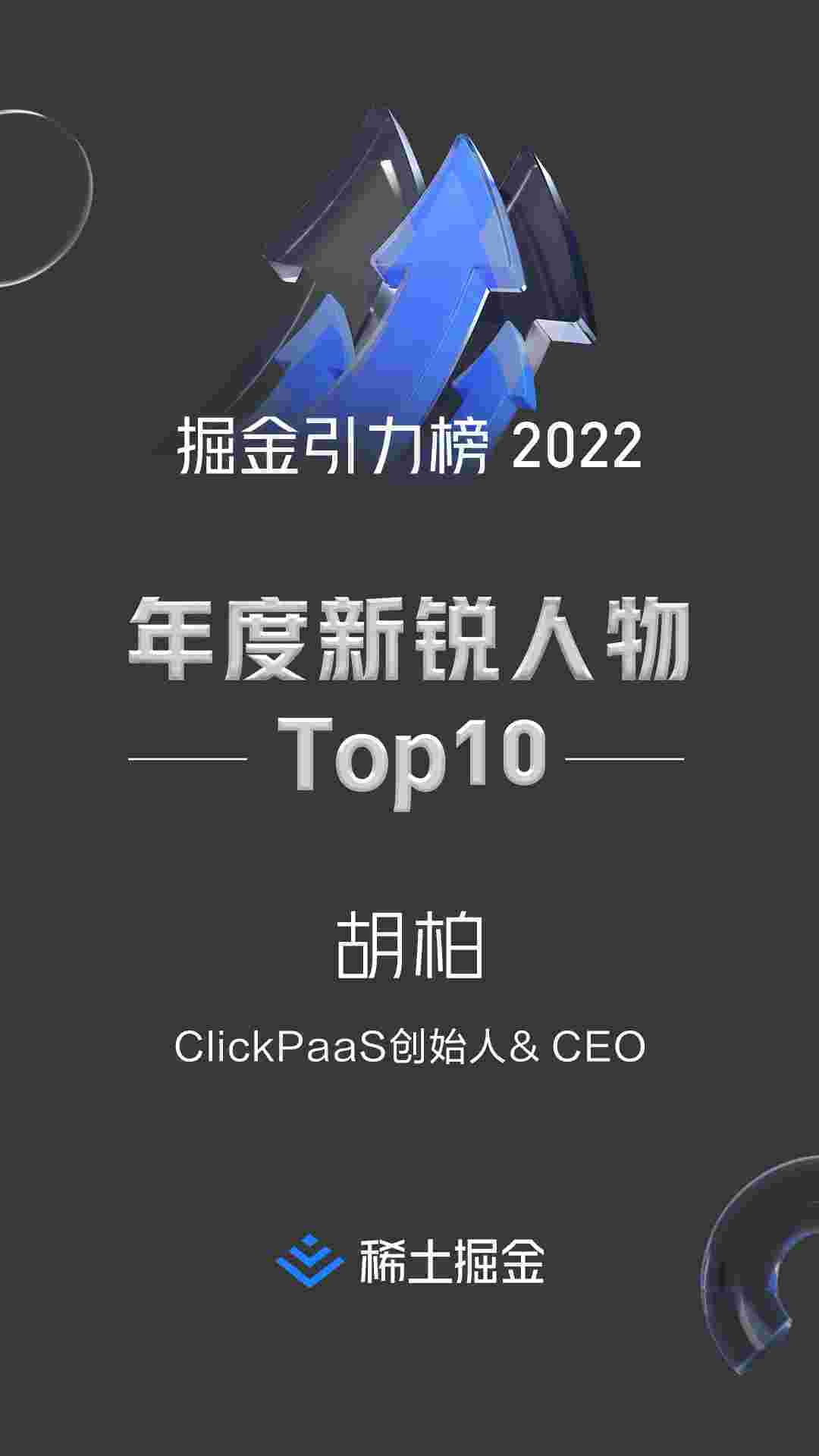 2022年1月6日,,,,,,,,稀土掘金社区第一届「掘金未来大会」成功举办,,,,,,,,,,,会上发布了“2022 稀土掘金引力榜 年度新锐人物”榜单,,,,,上海爱湃斯科技有限公司(简称VIVO钱包)创始人及CEO胡柏实力入选年度新锐人物TOP 10。。。。。。。。